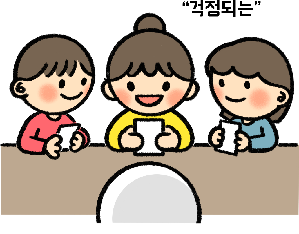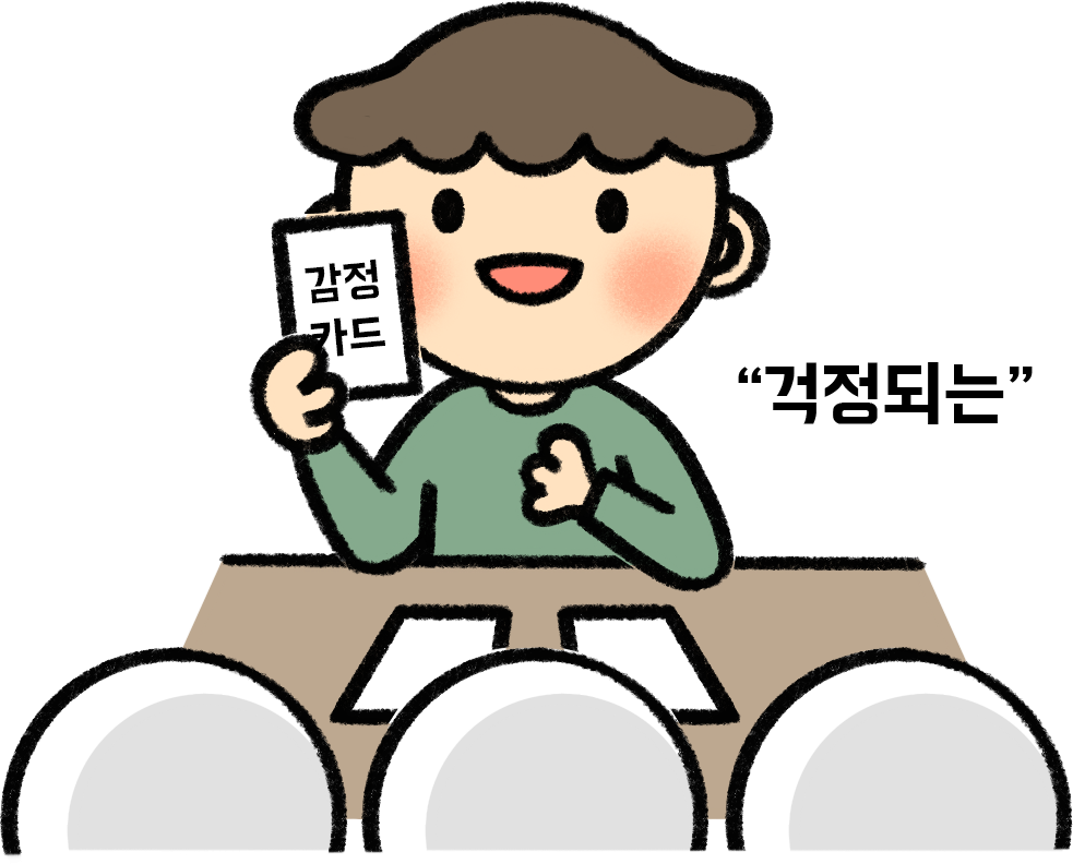 ※ 등에 붙이는 것 대신 이마에 카드를 살짝 붙이거나 감정 카드를 무작위로 선택하되, 자기가 선택한 감정 카드 내용을 보지 않고 다른 모둠원들이 잘 보도록 하는 방법도 좋은 방법이다. (감정 거울)