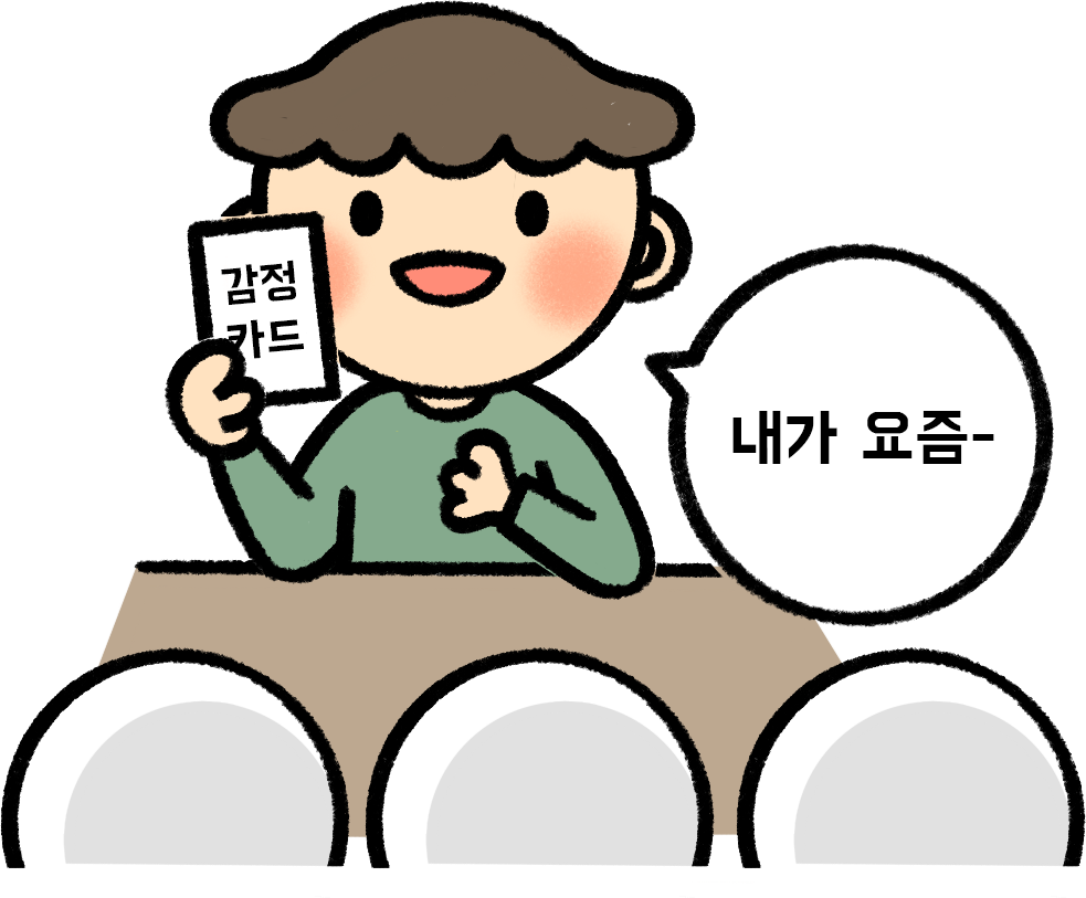 ② 첫 번째 모둠원이 자신의 감정 카드를 나머지 친구들에게 보여준다.