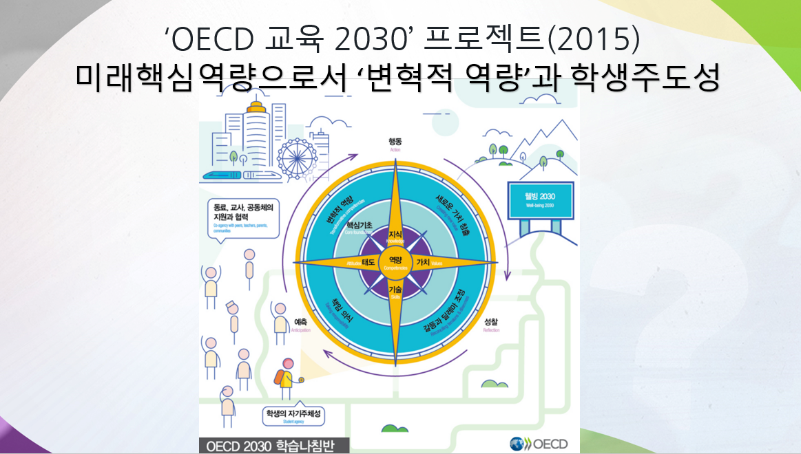 특히 OECD 교육 2030에서 미래핵심역량으로 ‘변혁적 역량’을 강조하면서 학생의 자기주도성을 강조하고 있지만, 우리 교육 현실은 이를 충분히 담아내고 있지 못하다. 역량이란 과제나 역할을 수행하는 데 필요한 능력이다.