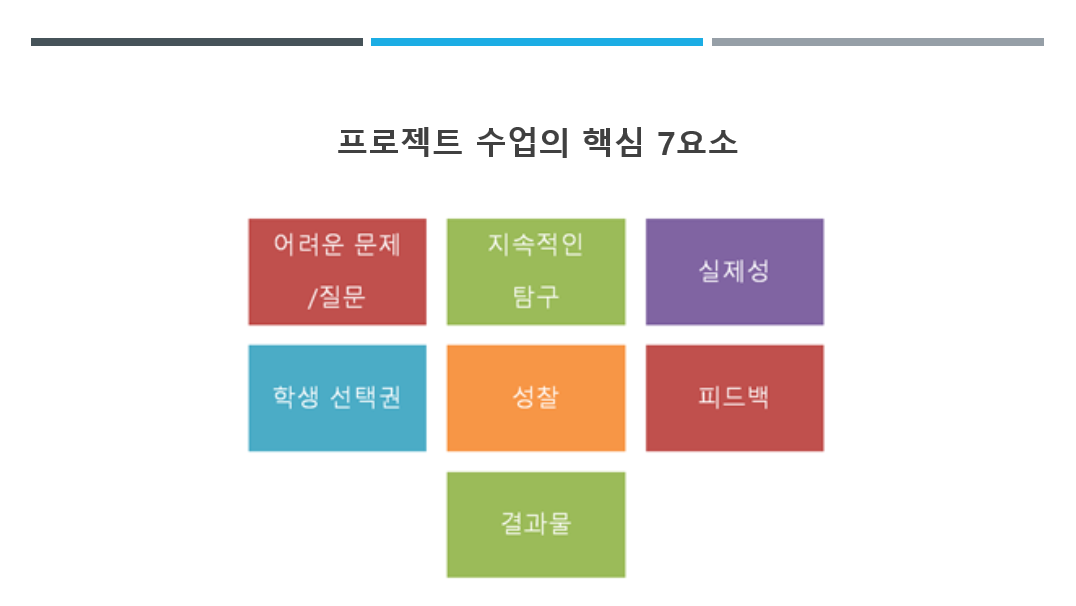 프로젝트 수업은 교실에서 다양하게 변형되어 적용되고 있다. 프로젝트 수업의 핵심 요소는 어려운 문제나 질문, 지속적인 탐구, 실제성, 학생 선택권, 결과물, 성찰, 피드백이다.(존 라머 외, 2017)