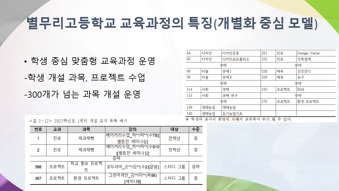 프로젝트 기반 수업(Project-based Learning)은 프로젝트 수업을 전제로 전체 과목을 운영하는 것을 말한다. 프로젝트 수업을 하나의 수업 모형 정도로 삽입하는 것이 아니라 과목 개설 자체를 프로젝트 수업으로 진행하는 것을 전제로 구성하는 것이다. 프로젝트 기반 수업은 교육과정 재구성 수준을 넘어 교육과정 개발로 접근할 수 있다. 별무리고교의 경우, 학생 개설 과목을 운영하여 전교생 120명 정도의 작은 학교임에도 불구하고, 고교 학점제 차원에서 학기당 300개가 넘는 과목을 개설하여 운영할 수 있었다.