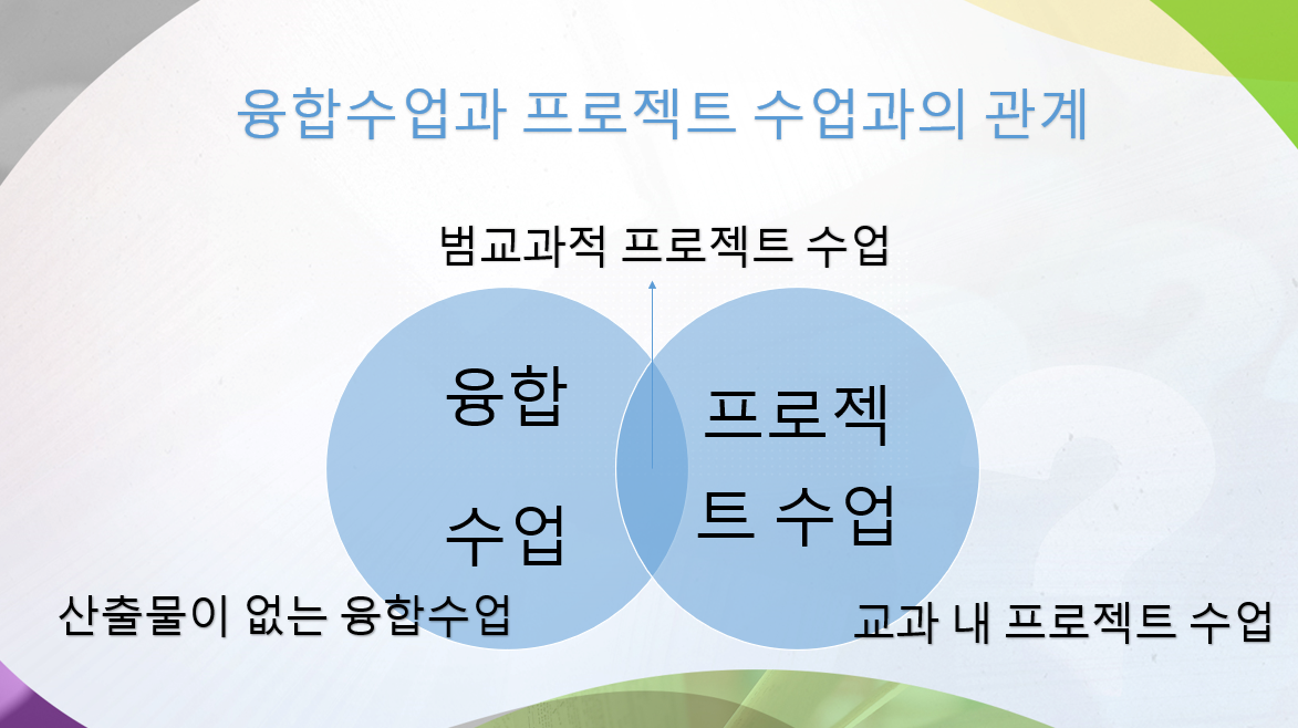 교육 현장에서는 프로젝트 수업과 융합 수업을 혼동하는 경우가 많다. 융합 수업은 특정 주제를 중심으로 교과를 넘나들며 접근하는 교수학습전략이다. 프로젝트 수업은 학생의 탐구 주제를 중심으로 자기주도적으로 접근하는 교수학습전략이다. 프로젝트 수업을 융합수업으로 운영할 수 있다. 하지만 프로젝트 수업이라고 해서 모두가 융합수업은 아니다. 왜냐하면 교과 내 프로젝트 수업은 융합 수업이 아니기 때문이다. 낮은 수준의 산출물이 나왔다면 융합수업일수 있어도 프로젝트 수업이라고 말하기 쉽지 않다. 왜냐하면 어려운 문제, 지속 가능한 탐구, 높은 수준의 산출물이 나와야 프로젝트 수업이라고 할 수 있기 때문이다.