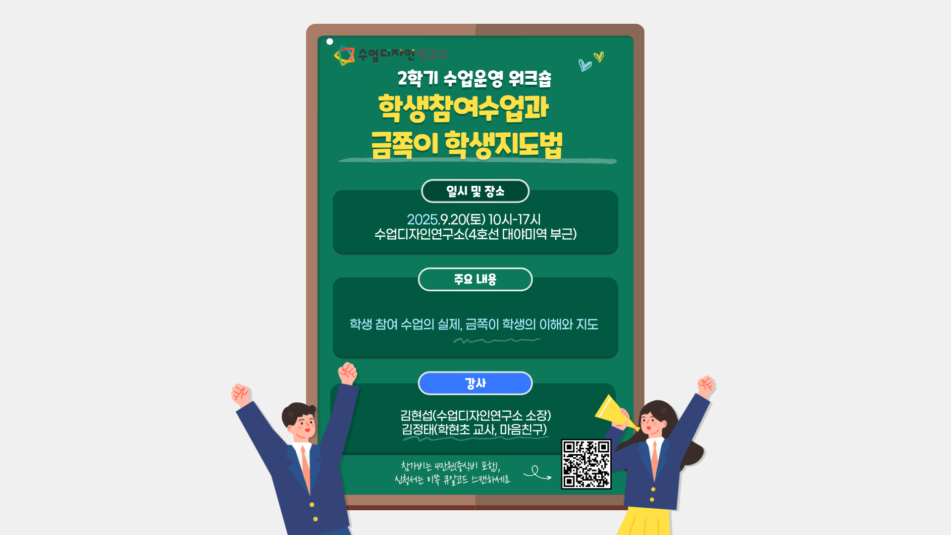2학기 수업을 보다 풍성한 수업으로 운영하기 위한 학생참여수업과 금쪽이학생 지도법 워크숍을 아래와 같이 개최합니다. 풍성한 수업을 꿈꾸고, 금쪽이 학생들로 인하여 고민하는 선생님들의 참여를 기다립니다.