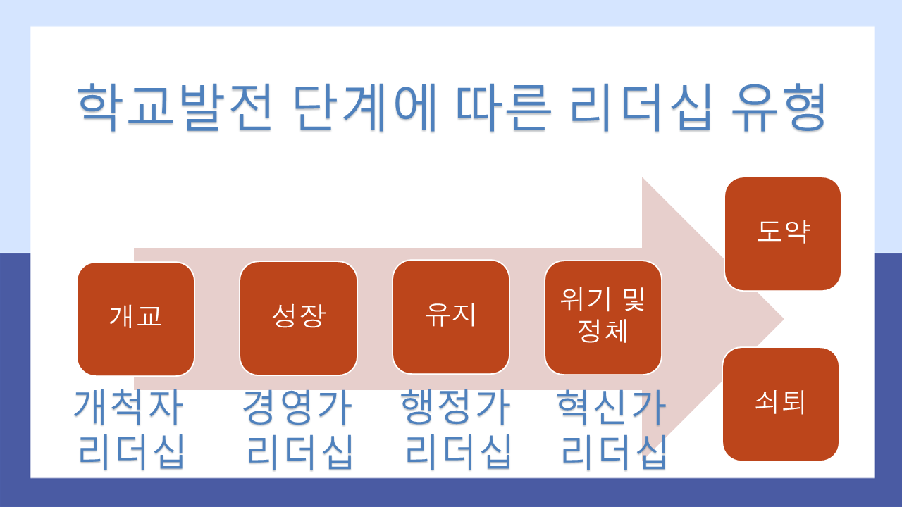어떤 유형의 학교 리더십이 더 좋다고 쉽게 말할 수 없다. 왜냐하면 학교는 발전 단계에 따라 그에 맞는 리더십이 요구되기 때문이다. 학교 설립 단계에서는 개척자 리더십이 필요하다. 학교 성장 단계에서는 경영가 리더십이 필요하다. 학교 안정 및 유지 단계에서는 행정가 리더십이 필요하다. 학교 위기 단계에서는 혁신가 리더십이 필요하다.