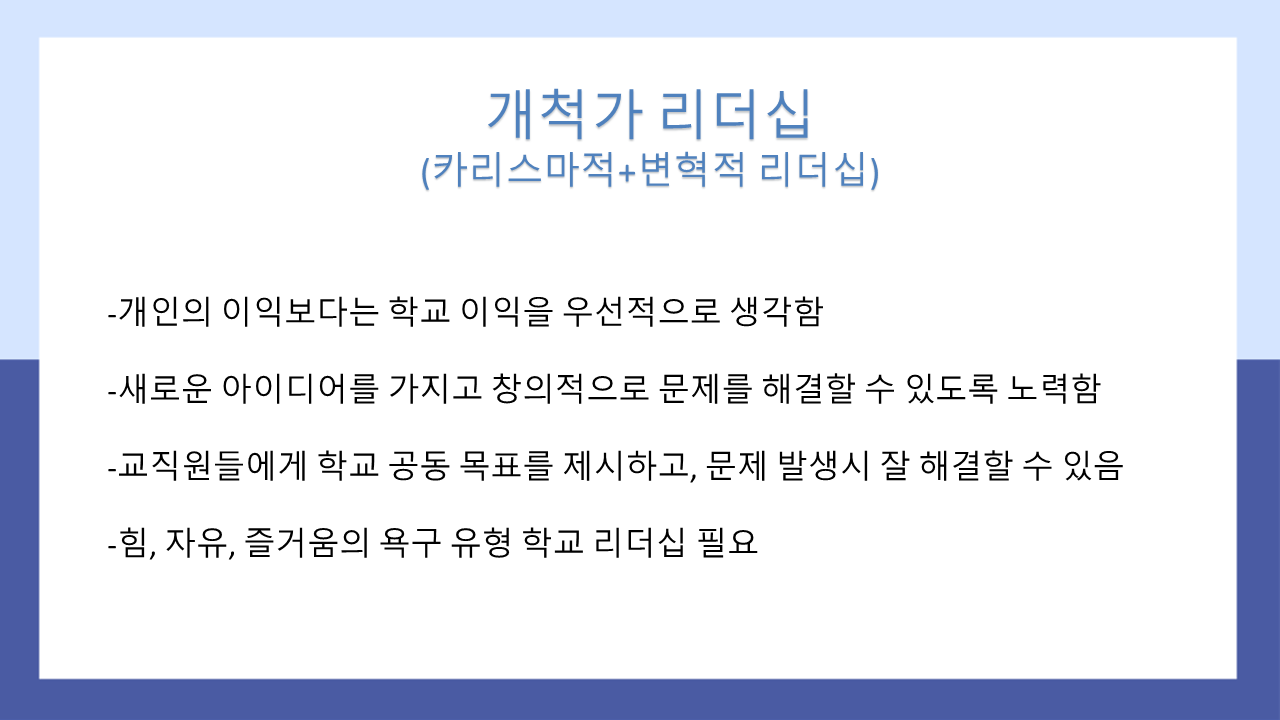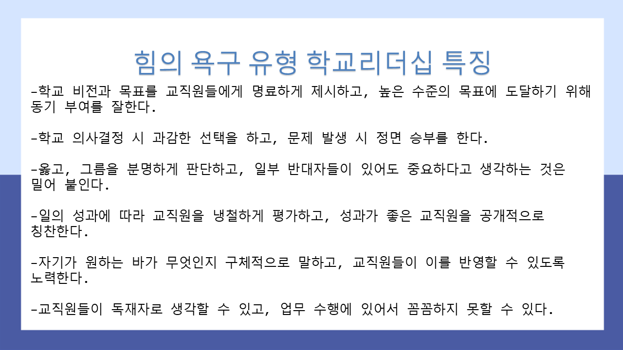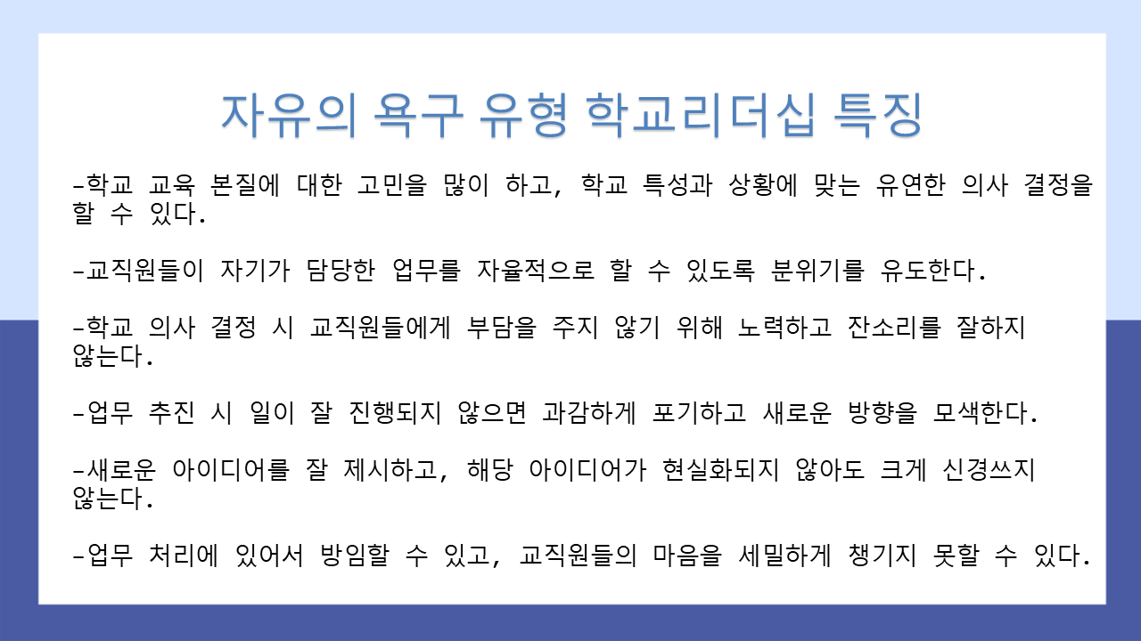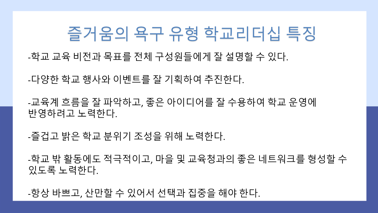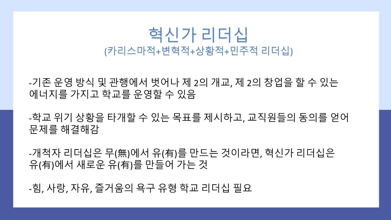 -학교 교육 본질에 대한 고민을 많이 하고, 학교 특성과 상황에 맞는 유연한 의사 결정을 할 수 있다.